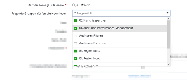 Welche Gruppen hier zur Auswahl stehen, legt ein Administrator direkt bei den Benutzergruppen mit der Option "Auswahl für News" fest |