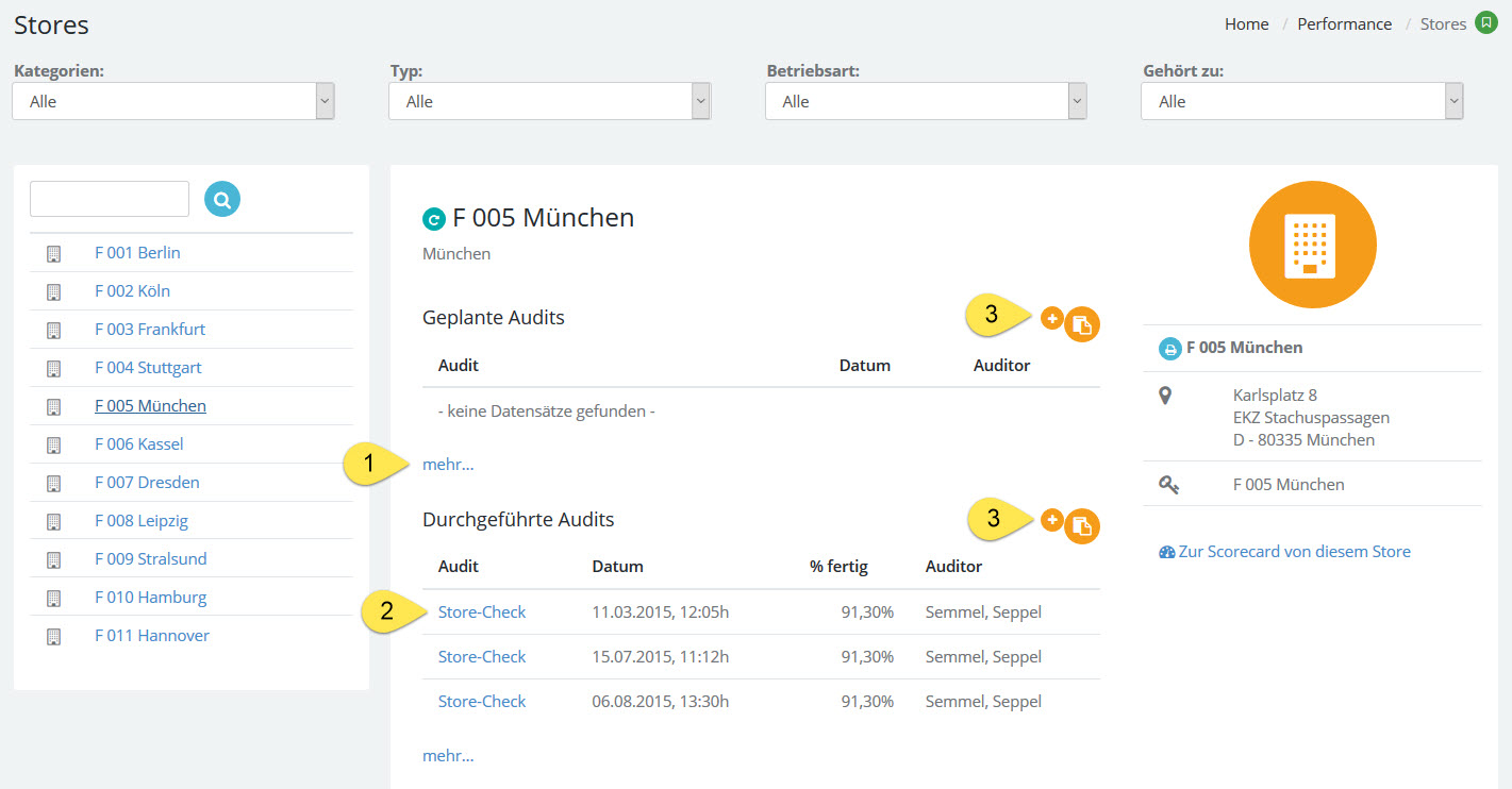 Auf der Store-Homepage werden die Stammdaten des Stores und die aktuellen Audits und Maßnahmen übersichtlich dargestellt: