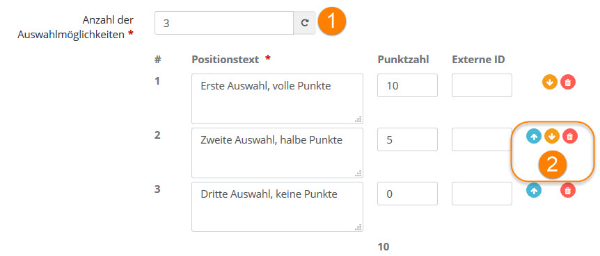 Wählen Sie den Themenbereich aus, in dem diese Position angezeigt werden soll. Die Punktzahl der Position fließt dann in die Gesamtbewertung dieses Themenbereiches ein. |