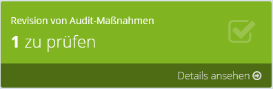 Der Maßnahmenempfänger kann dann den Status der Maßnahme nicht mehr direkt auf „erledigt“ setzen, sondern muss die Maßnahme „zur Prüfung vorlegen“. Dadurch wird der Revisor benachrichtigt und die Maßnahme erscheint in einer neuen Info-Kachel auf der Startseite des Revisors „Revision von Audit-Maßnahmen“:
