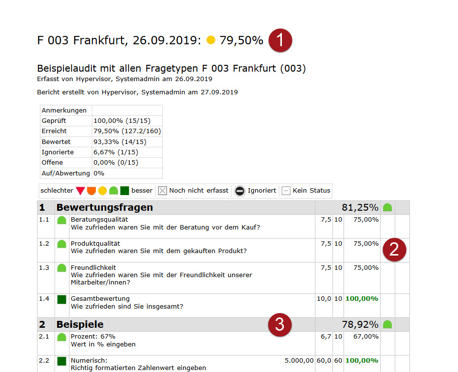 Für jede Position wird der Ampelstatus, die erreichte Punktzahl, die maximal erreichbare Punktzahl und der Zielerreichungsgrad in Prozent dargestellt. (2). Falls vorhanden werden auch Kommentar und Maßnahmen angezeigt.