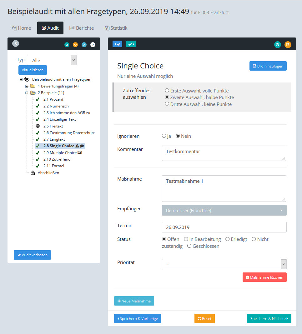 Die Bewertungsmöglichkeiten der Prüfposition werden bei der Definition des Audits vorgegeben. Die obige Abbildung zeigt z.B. eine Position vom Typ Single Choice. |
