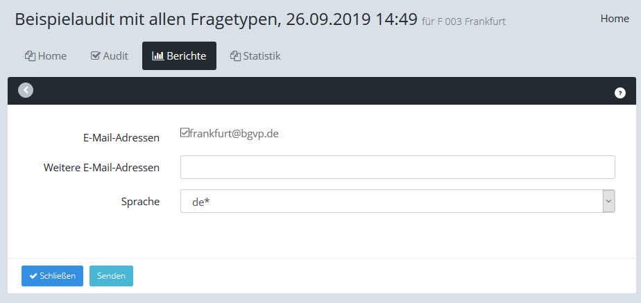 Auf der Registerkarte "Berichte" können Sie einen Bericht mit den Ergebnissen des Audits erzeugen und via Email oder Fax versenden.