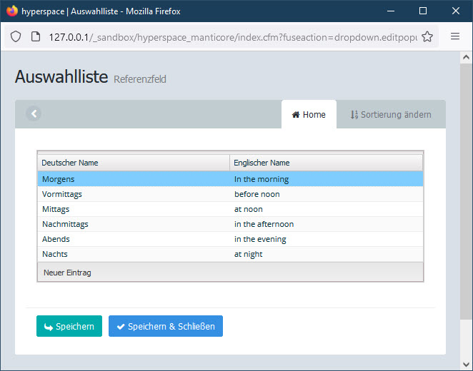 Hier können Sie vorhandene Einträge durch Anklicken ändern oder durch Klick auf [Neuer Eintrag] eine neue leere Zeile in der Liste erzeugen, wo Sie dann die entsprechenden Auswahltexte erfassen können.