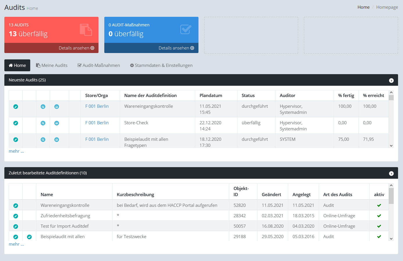 Die Homepage der Audits zeigt eine Übersicht der aktuellen Audits und zuletzt bearbeiteten Audit-Definitionen.