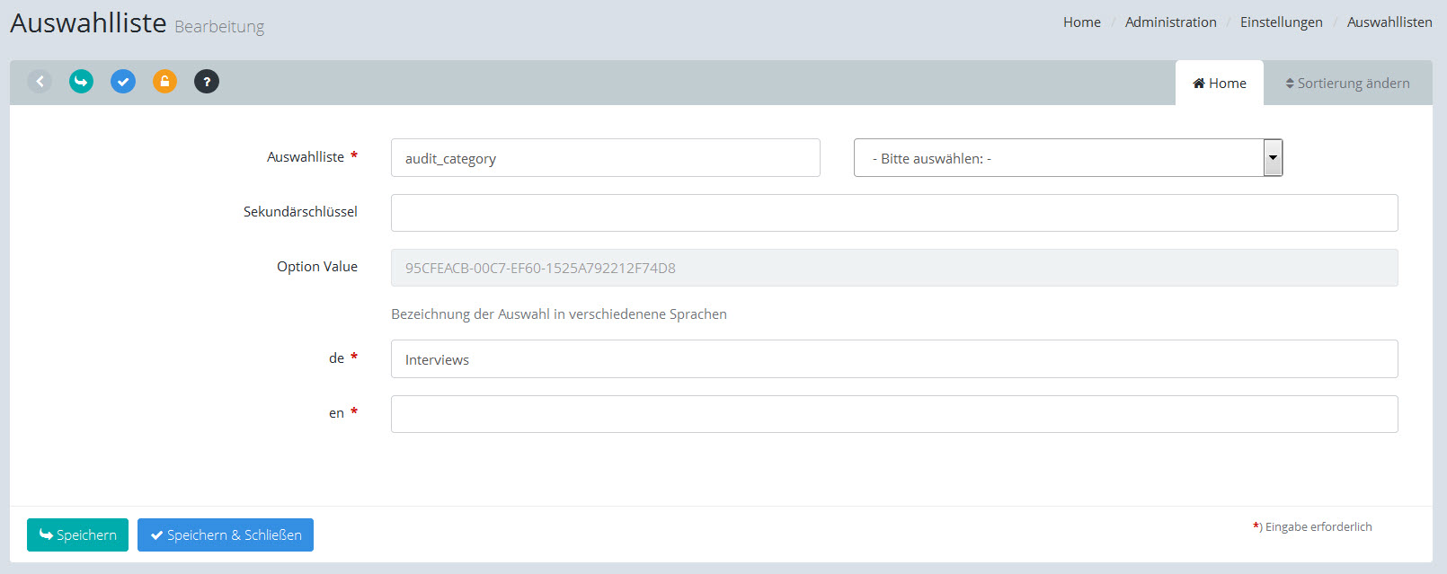 •Sie müssen die Bezeichnung der Auswahlmöglichkeit in deutsch und englisch erfassen. Wenn Sie die Benutzeroberfläche nur in deutsch benutzen, können Sie für "en" ebenfalls die deutsche Bezeichnung eingeben.