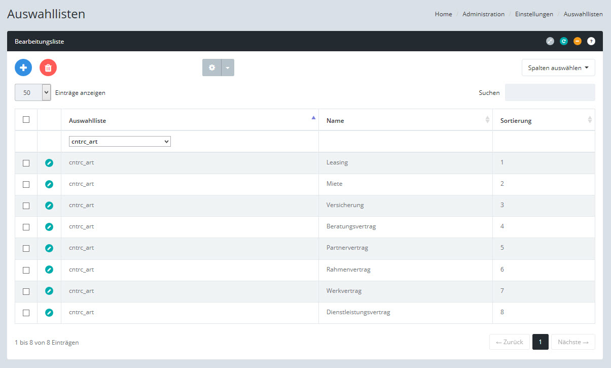 Mit dieser Anwendung legen Sie die vorgegebenen Auswahlmöglichkeiten für zahlreiche Auswahllisten fest (z.B. für die Dokumentenkategorien oder die Anreden beim hyXRM-Modul).