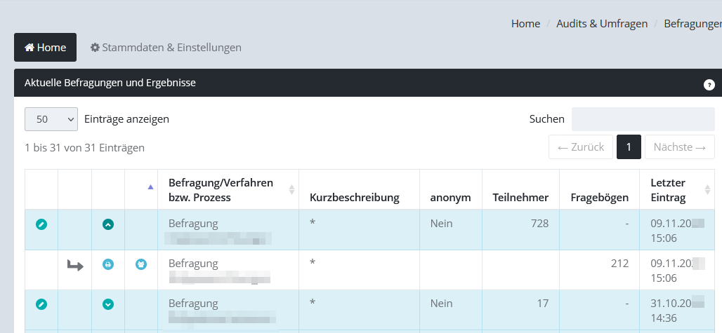 Die Befragungs-Homepage zeigt die aktuellen Befragungen und darunter eingerückt die einzelnen Prozessschritte an, sowie die wichtigsten Daten zum Rücklauf.