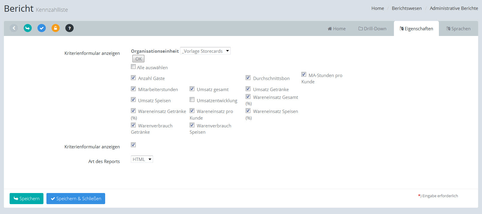 Art und Anzahl der Eigenschaften eines Berichtes hängen jeweils vom Bericht ab: Hier legen Sie z.B. die Kriterien des Berichtes und Formate für die Ausgabe der Daten fest. |