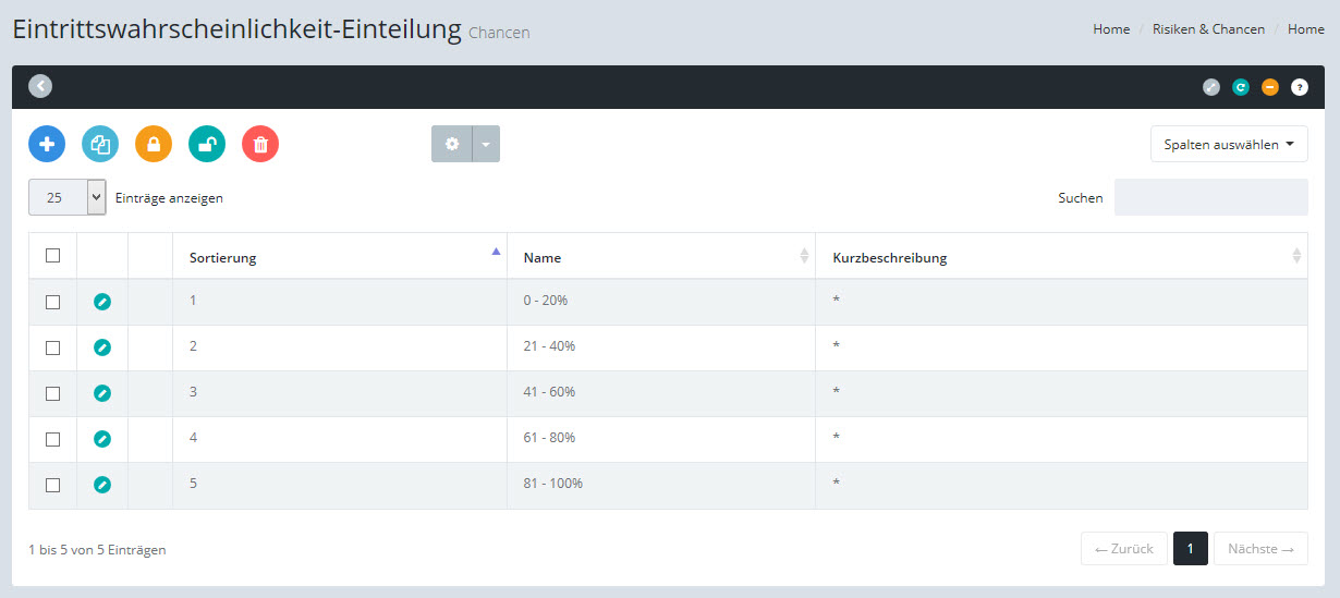 Sie können jeweils drei, vier oder fünf Unterteilungen für Potenzial und Eintrittswahrscheinlichkeit definieren und auch deren Namen frei festlegen.