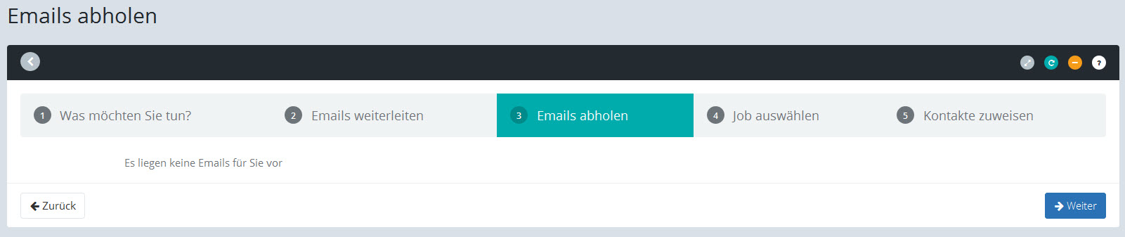 3.Nachdem Sie alle Emails mit Ihrem Email-Programm weitergeleitet haben und die Emails erfolgreich versendet wurden, wechseln Sie wieder zum Assistenten in hyScore und klicken dort [Weiter]. hyScore ruft daraufhin alle Emails vom angegebenen Emailkonte für den Import ab und speichert diese in einem Zwischenspeicher für die weitere Bearbeitung. Je nach Anzahl und Größe der Emails und Anlagen kann dies einige Zeit dauern. Am Ende des Vorgangs erscheint eine entsprechende Hinweismeldung:
