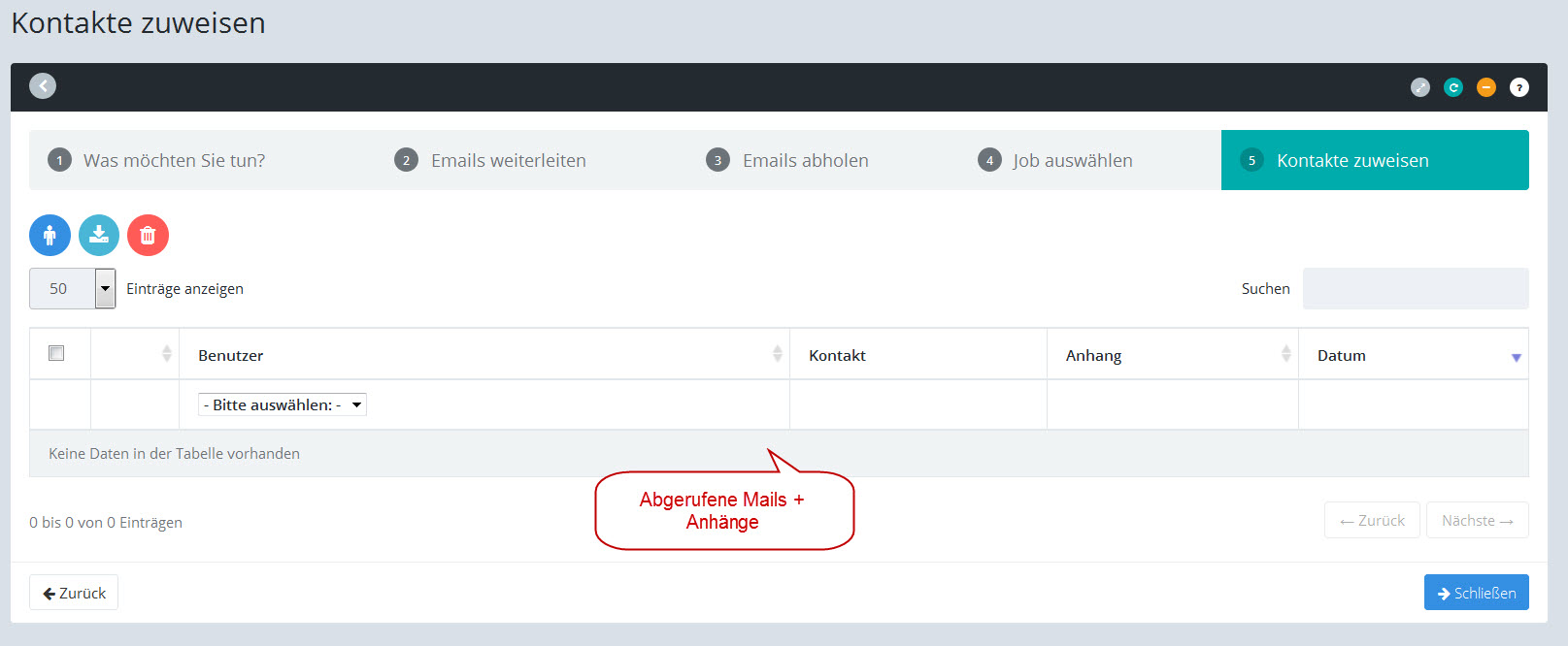 4.Klicken Sie auf [Weiter]. Dadurch werden die abgerufenen Emails mit den zugehörigen Anlagen angezeigt: