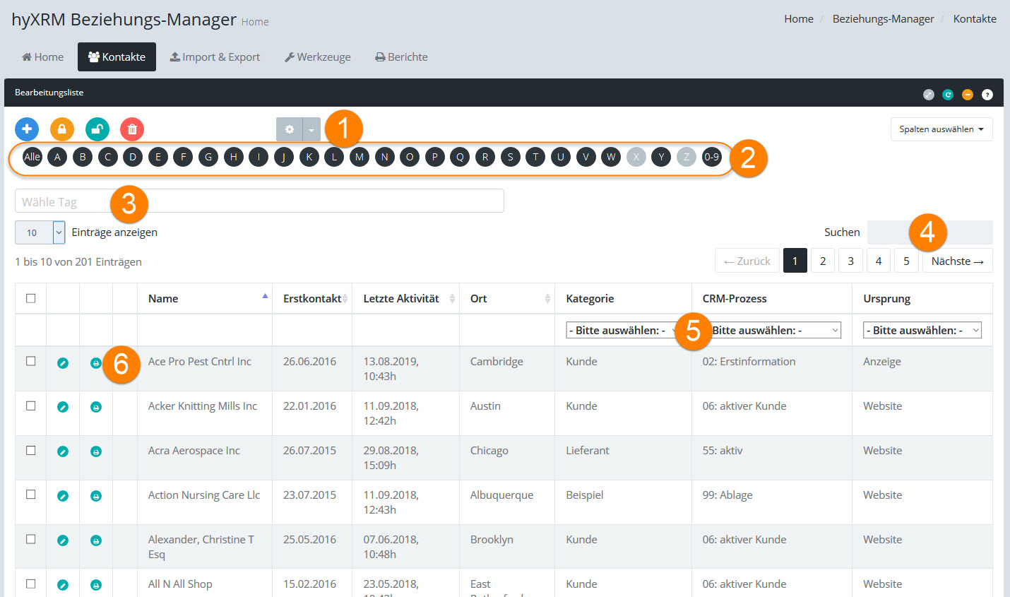 5.Sie können die Bearbeitungsliste nach "Kategorie", "CRM-Prozeß", "Ursprung" und "Gehört zu" filtern.