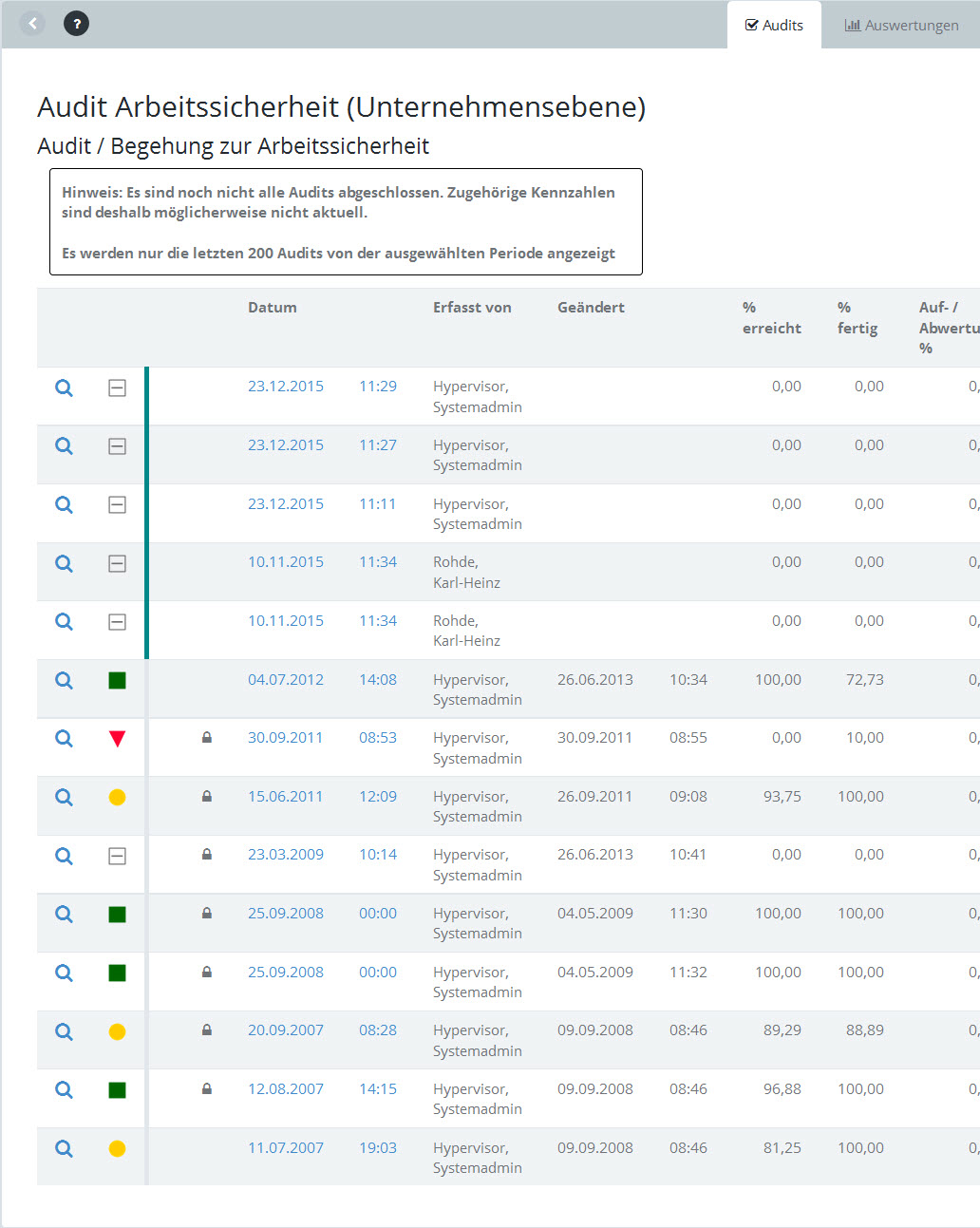 Die Registerkarte "Audits" zeigt eine Liste der durchgeführten Audits vom 1.1. des Vorjahres bis zum 31.12. des aktuellen Jahres an, höchstens jedoch 200 Audits.