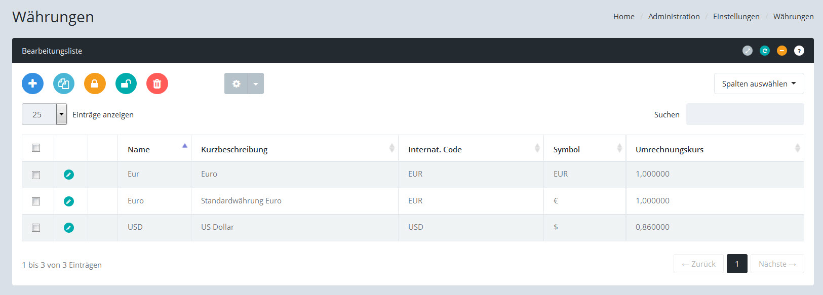 Hier sehen Sie die Bearbeitungsliste zu den Währungen. Sie können Währungen verwalten und Neue anlegen.