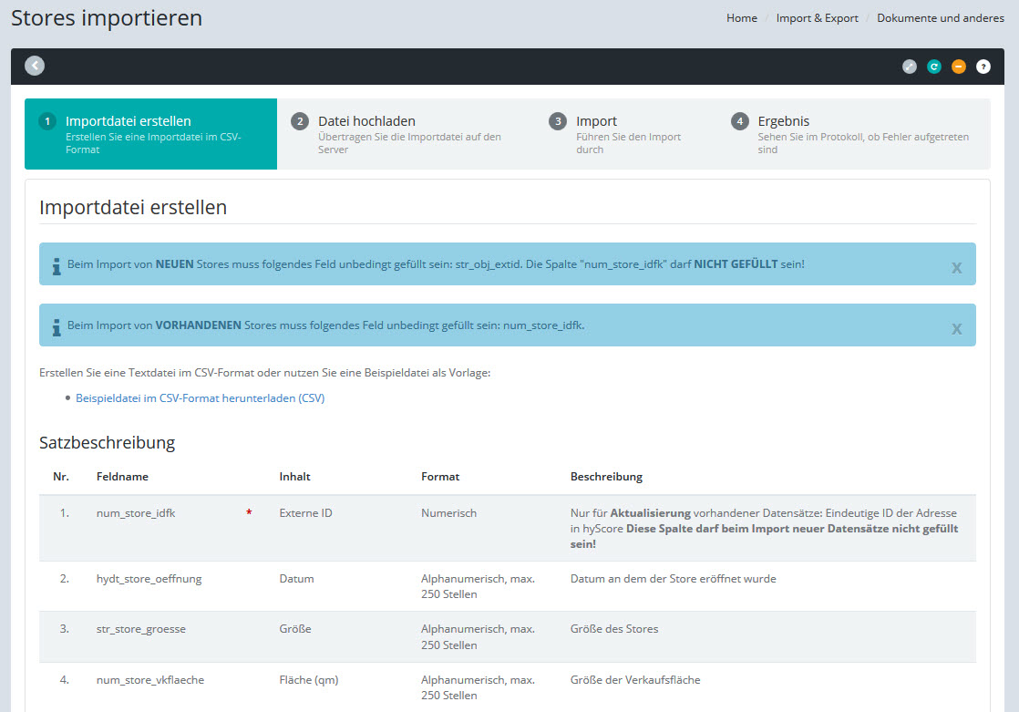 Die Importdateien für neue Stores oder Store-Änderungen sind jedoch unterschiedlich aufgebaut, Sie können deshalb im gleichen Importvorgang entweder nur neue Stores anlegen oder nur vorhandene Stores ändern.