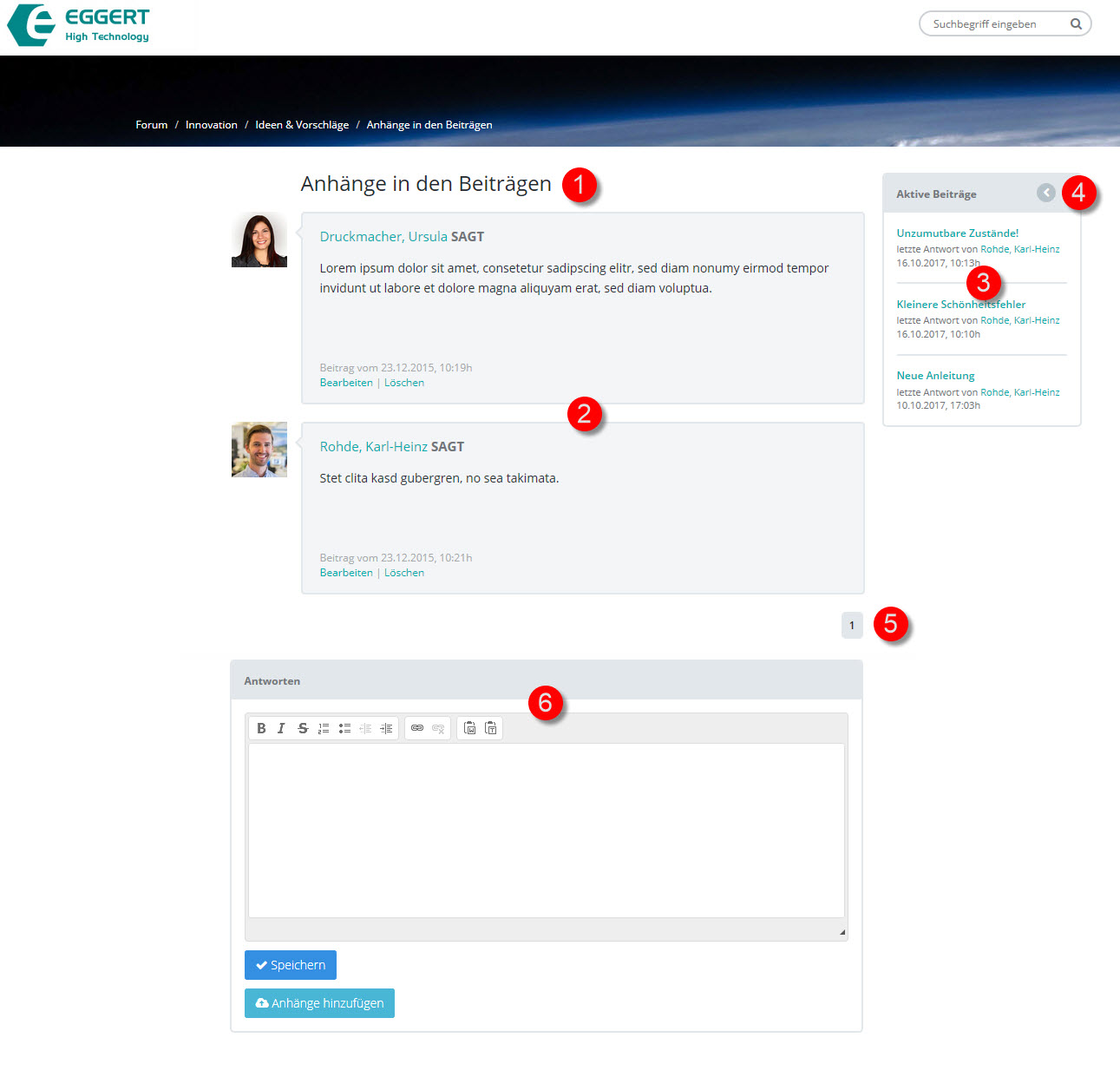 •In der Beitragsansicht einer Diskussion werden in chronologischer Folge die Beiträge (2) der Diskussionsteilnehmer zu diesem Thema (1) angezeigt.