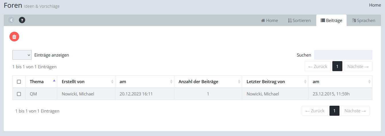 Die Regtabe "Beiträge" zeigt die Liste der Themen im aktuellen Forum an.