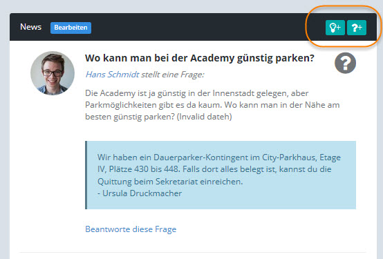 Wenn Fragen & Ideen aktiviert sind, kann jeder Benutzer im Newsbereich auf der Website und im Newsbereich auf der Persönlichen Home-Seite im Hauptsystem Fragen und Ideen zur Diskussion stellen.