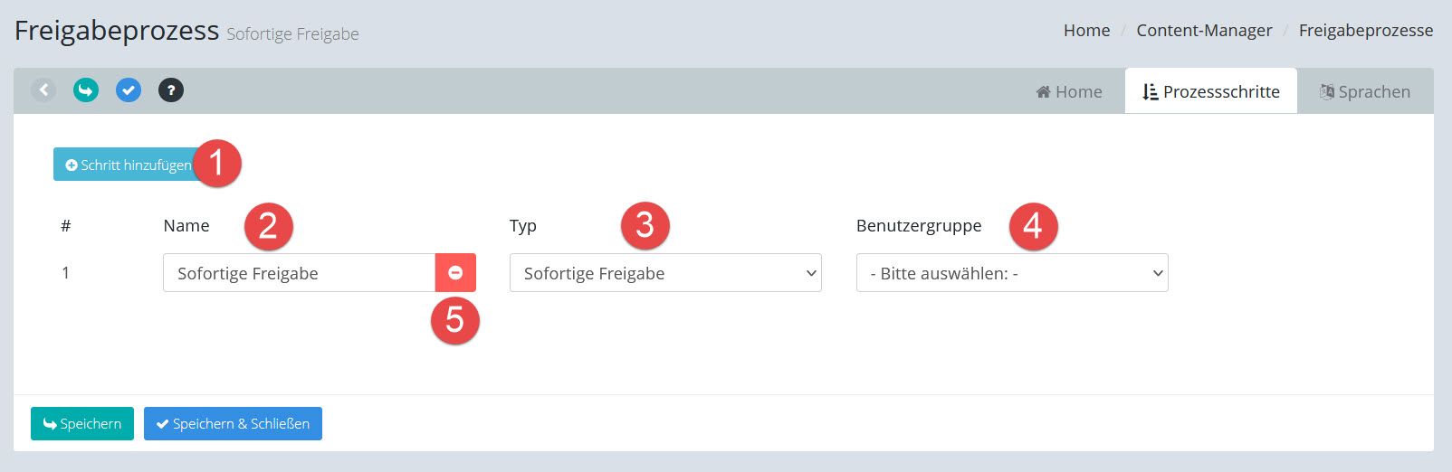 4.Benutzergruppe für diesen Schritt: Die Mitglieder dieser Gruppe werden benachrichtigt und können den entsprechenden Prozessschritt durchführen. Bei "Sofortige Freigabe" kann keine Benutzergruppe ausgewählt werden.