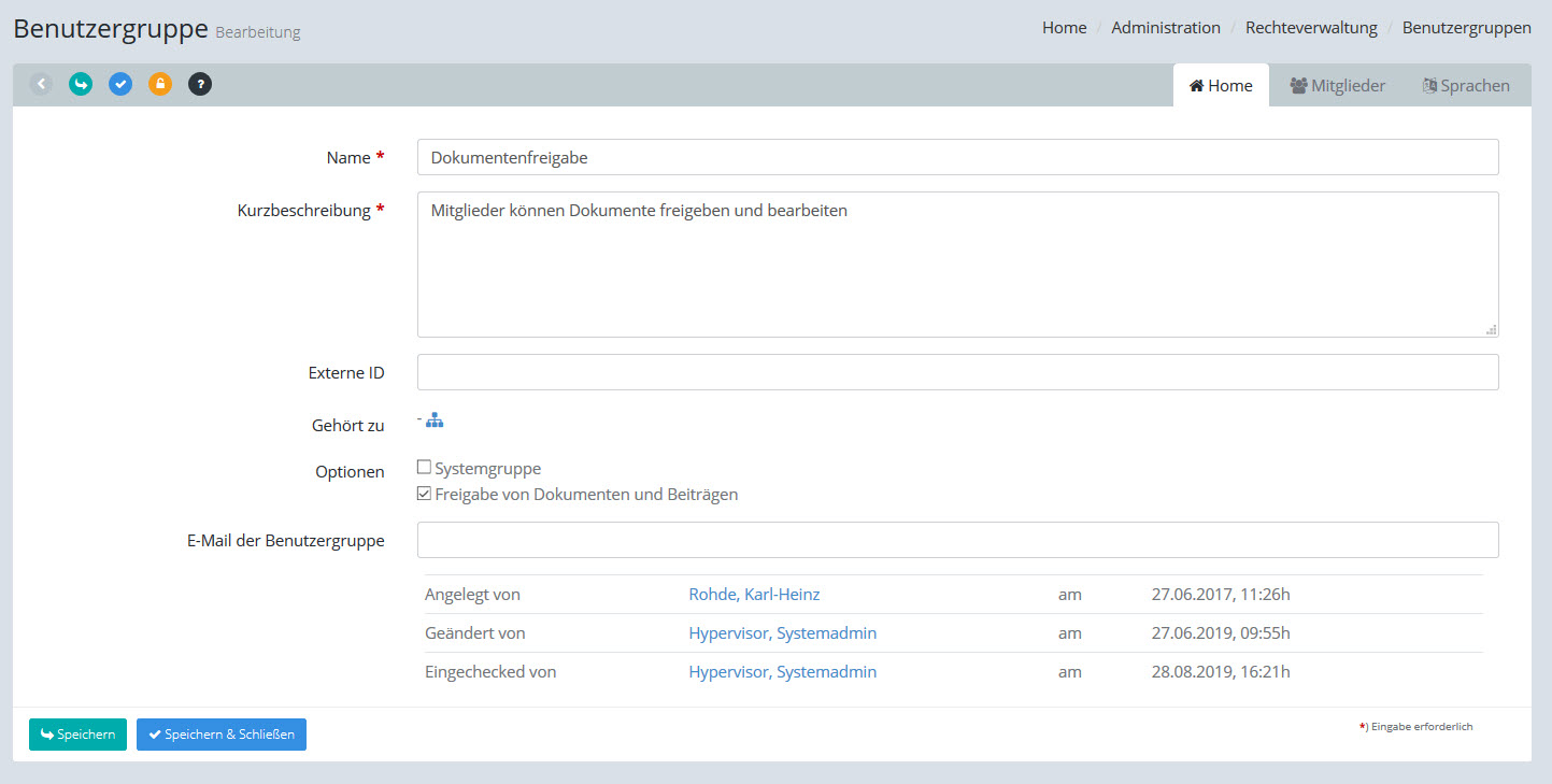 3.Um den Freigabeworkflow nutzen zu können, müssen Sie mindestens eine Benutzergruppe für diesen Zweck einrichten. Legen Sie dazu im Admin-Menü unter „Administration / Rechteverwaltung / Benutzergruppen“ entweder eine neue Benutzergruppe an oder wählen Sie eine vorhandene Gruppe zum Bearbeiten aus. Wechseln Sie zur Registerkarte „Einstellungen“ und aktivieren Sie die Option „Freigabe von Dokumenten und Beiträgen“: