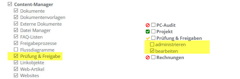 4.Für Rollen, deren Benutzer Dokumente prüfen und freigeben sollen, müssen Sie in der Rolle das Menürecht "Prüfung & Freigabe" und bei den Funktions-Rechten für "Prüfung & Freigaben" das Recht "bearbeiten" aktivieren: