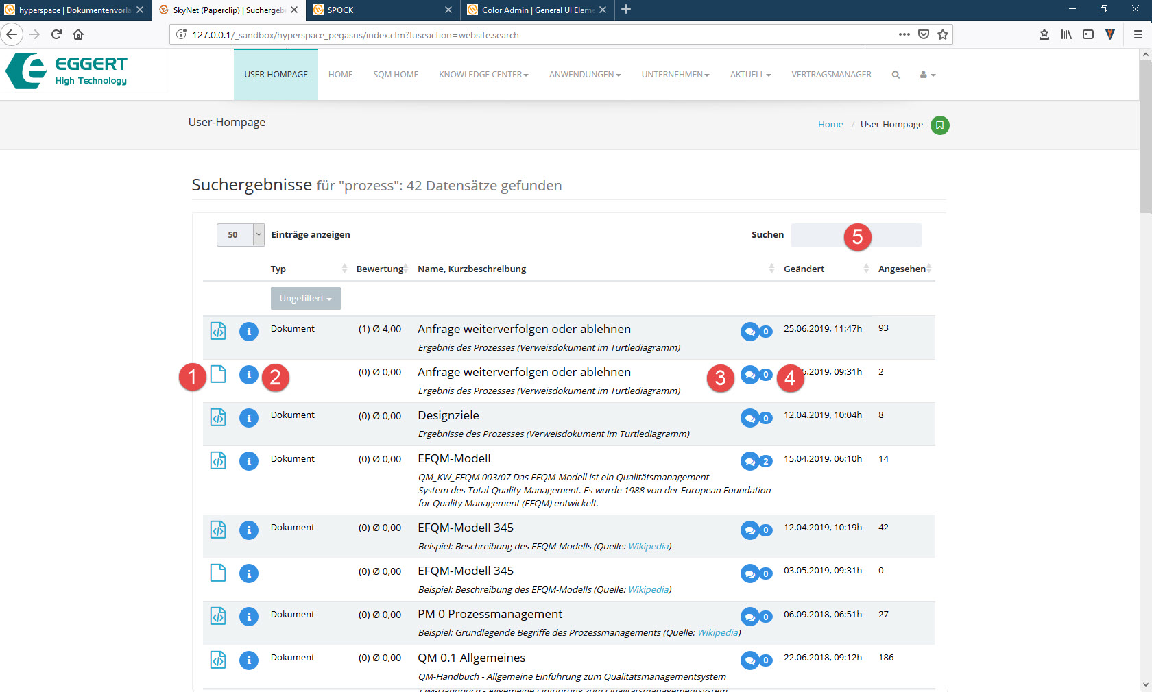 Das Suchfeld in jeder Bearbeitungsliste ermöglicht eine Echtzeitsuche bereits während der Eingabe. Das Suchfeld färbt sich rot, sobald ein Suchbegriff eingegeben wurde, damit leichter erkennbar ist, dass die aktuelle Listenansicht durch den Suchbegriff gefiltert wird.