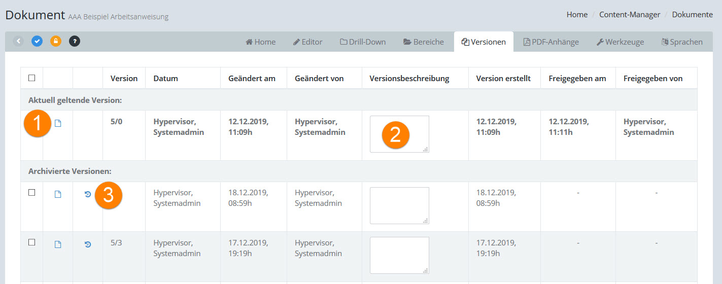 3.Button zum Wiederherstellen des Inhaltes eines archivierten Version: Der Inhalt des Editors wird dabei durch den Inhalt der archivierten Version ersetzt; das Dokument muss anschließend neu freigegeben werden.