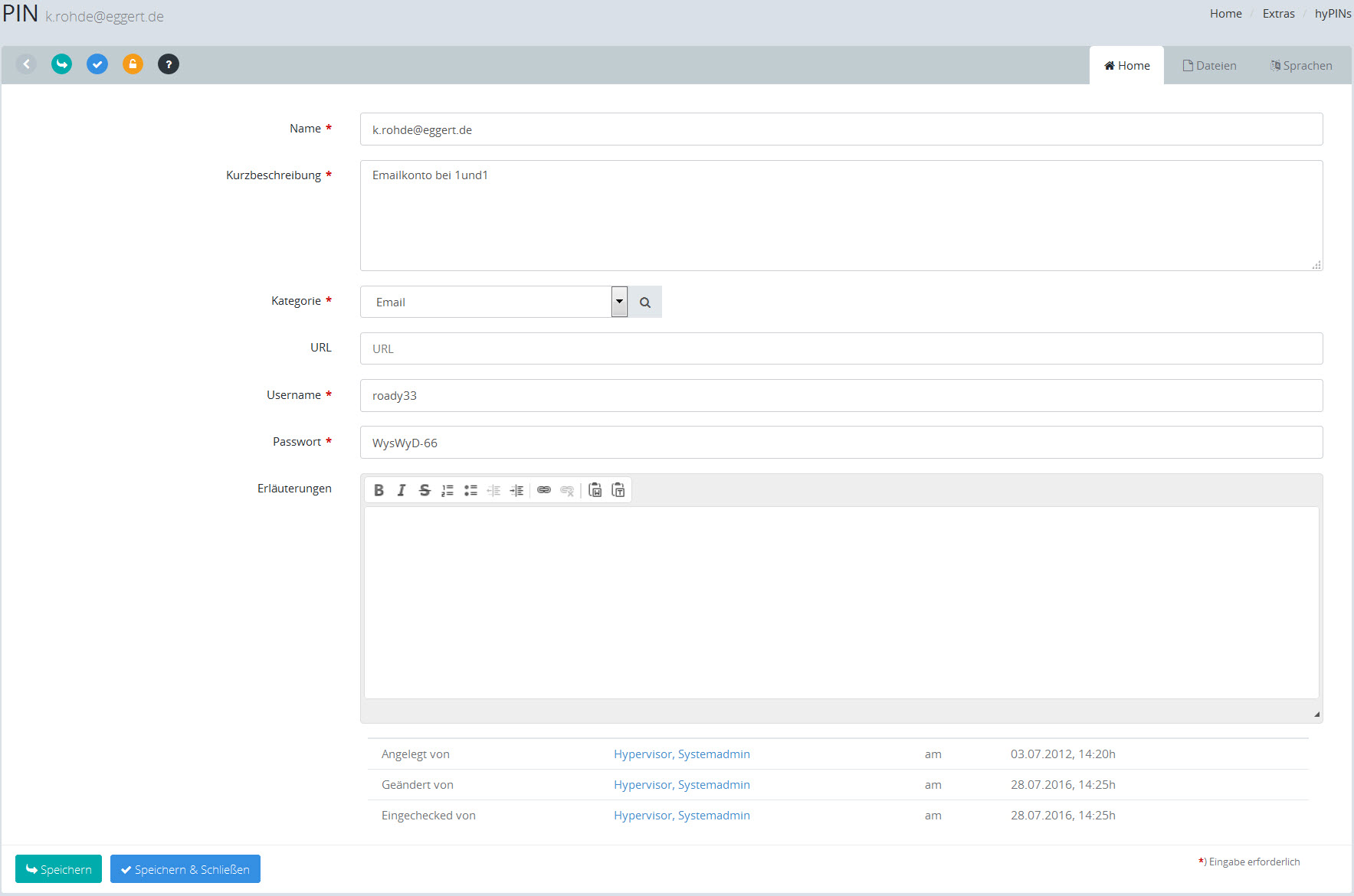 Hier sehen Sie, welcher Nutzer diesen Eintrag erzeugt, zuletzt geändert sowie zuletzt eingecheckt hat. Klicken Sie auf den Usernamen, um auf die Profilseite des jeweiligen Users zu gelangen. |