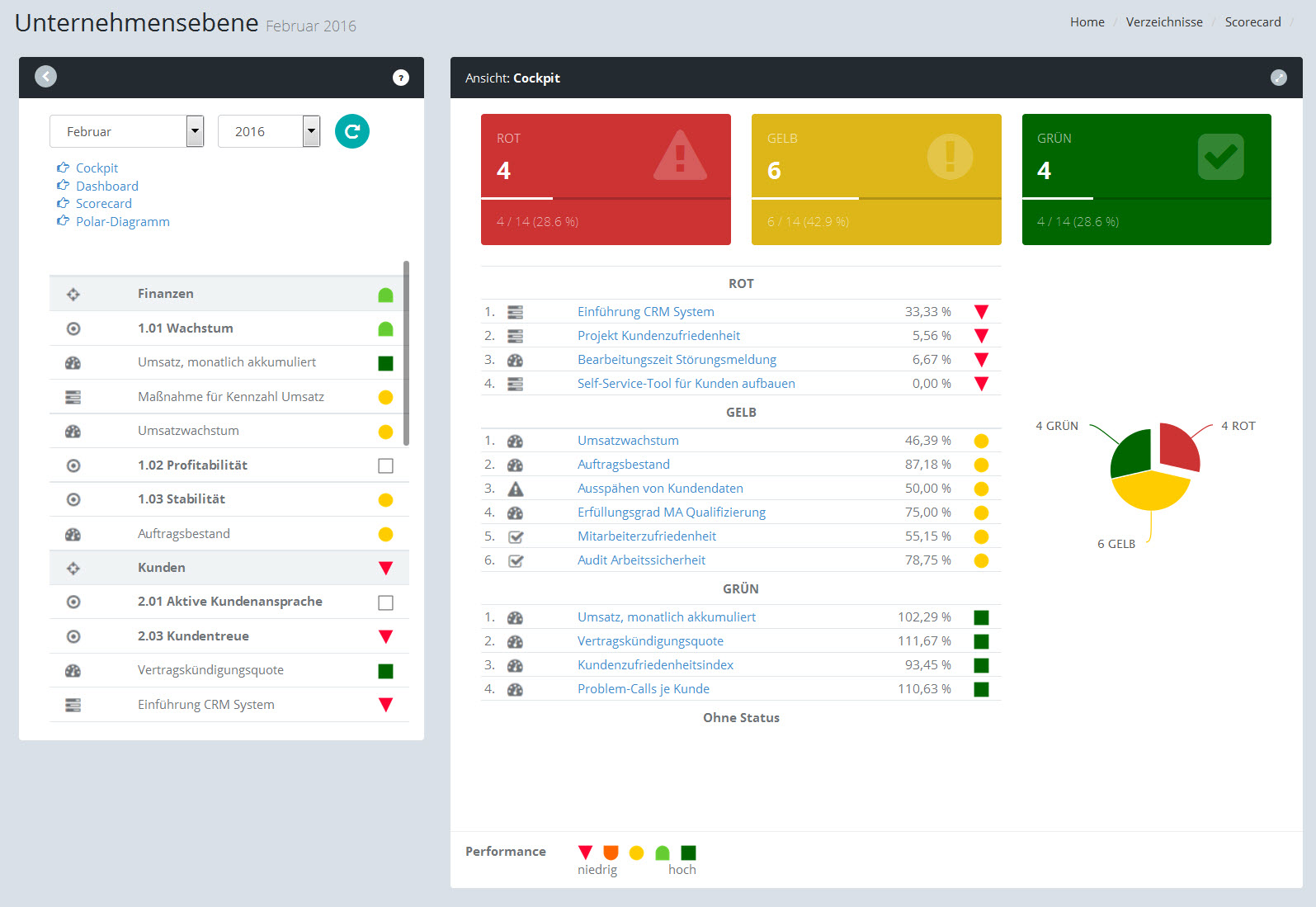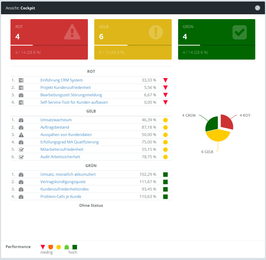 Das Cockpit zeigt sehr übersichtlich den Status der Perspektiven und Ziele an. Untergeordnete Elemente der Ziele werden hier nur mit ihrem Status-Icon angezeigt. Der Schwerpunkt liegt in dieser Ansicht darauf, möglichst schnell auf die Elemente mit rotem Status-Icon zugreifen zu können.