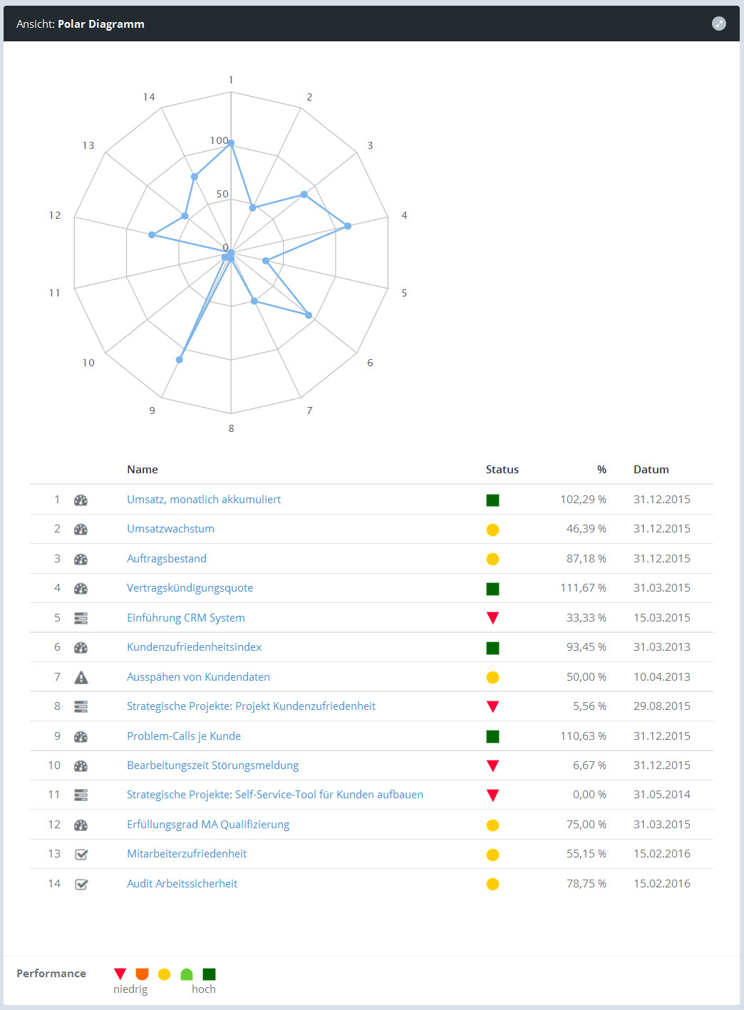 Das Polar Diagramm ("Spinnennetz-Diagramm") legt den Schwerpunkt der Darstellung nicht auf den aktuellen Status, sondern auf die Zielerreichung der einzelnen Elemente in der Scorecard.