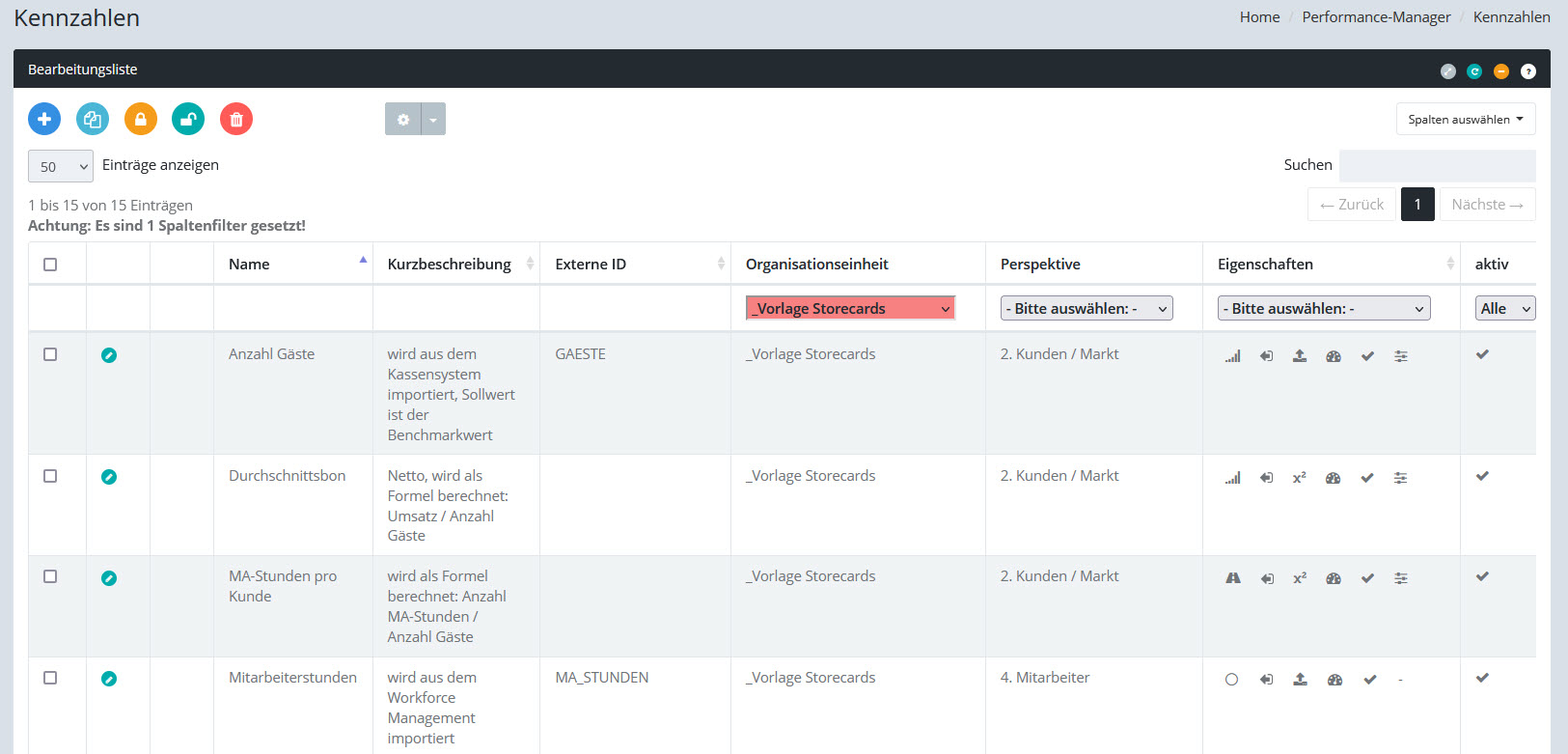 Die Suchfunktion durchsucht nicht nur Name und Beschreibung, sondern auch die "Externe ID" sowie die Objekt-ID der Kennzahl.