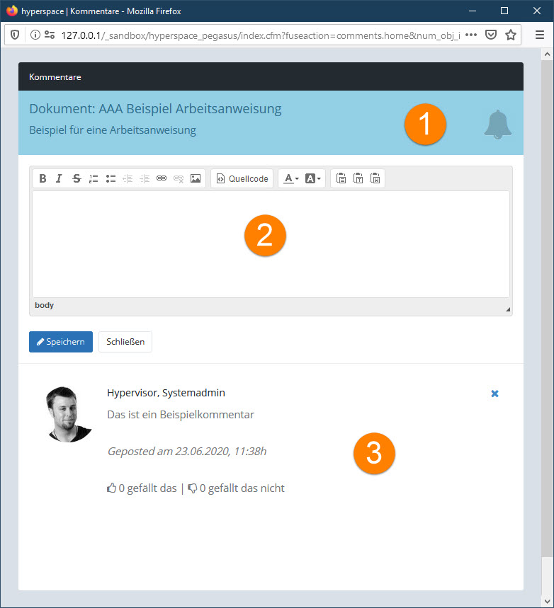 3.Die bereits vorhandenen Kommentare werden in diesem Bereich angezeigt. Der Text kann im Nachhinein nicht mehr verändert werden. Administratoren, der Verfasser des Kommentars und der Bearbeiter des zugehörigen Objektes können einen Kommentar jedoch löschen. Außerdem kann jeder Leser des Kommentars den Kommentar durch Anklicken der Symbole "Daumen hoch" bzw. "Daumen runter" bewerten, falls die Bewertungsfunktion freigeschaltet wurde.