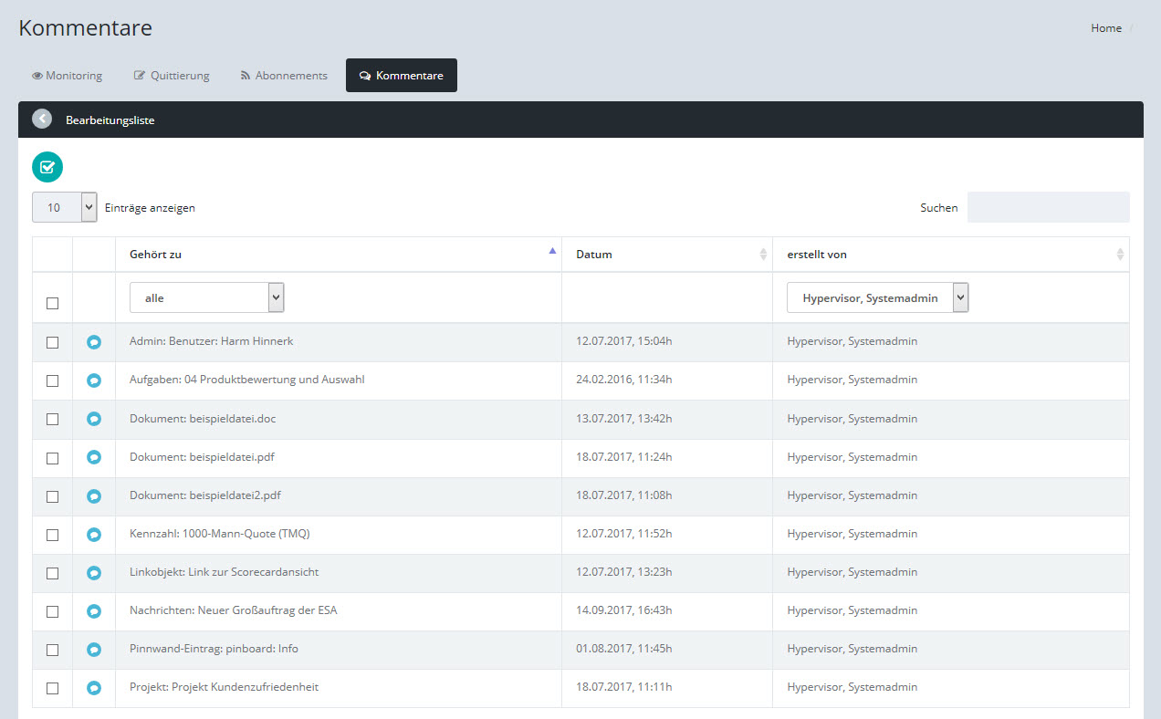 Hier werden Ihre eigenen Kommentare angezeigt sowie alle Kommentare zu Objekten, für die Sie verantwortlich sind.