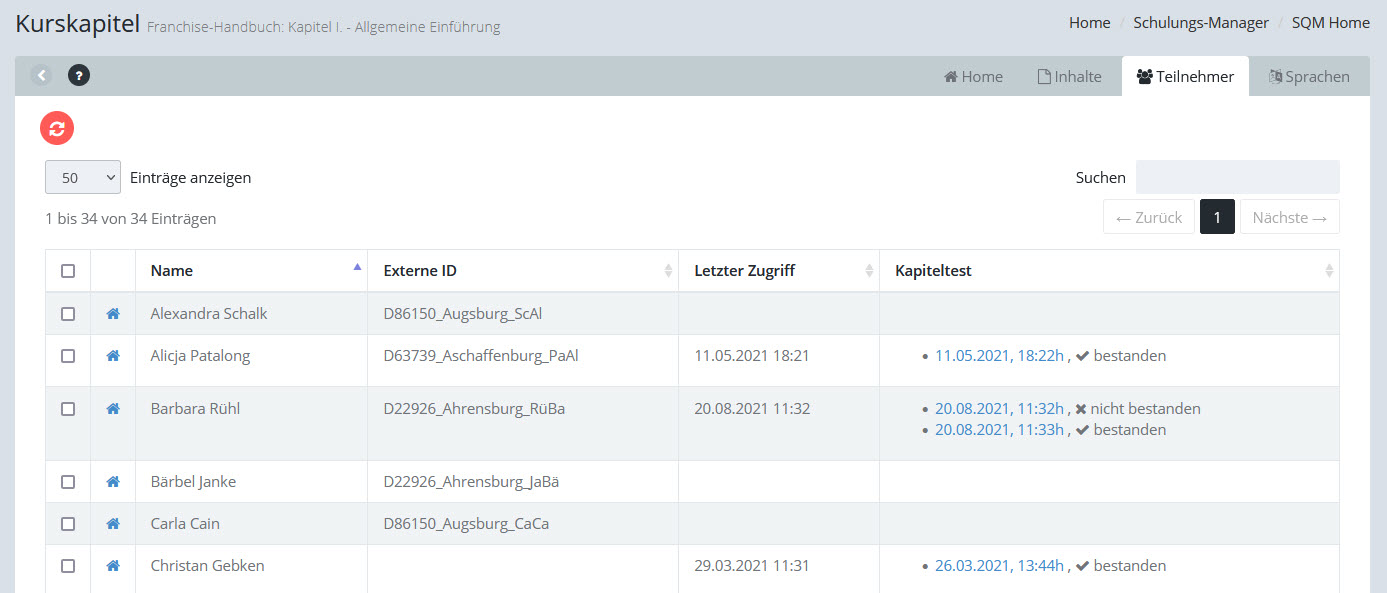 Mit dem roten Refresh-Button über der Liste kann man für die angekreuzten Teilnehmer die nicht bestandenen Kapiteltests löschen.