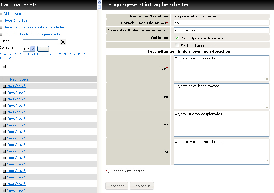 Nach dem Ändern müssen Sie die Languageset-Dateien mit dem entsprechenden Menü-Link im mittleren Frame neu erstellen.