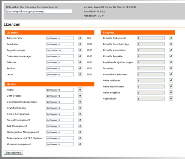 Mit der Lizenzverwaltung können Sie die hyScore-Seriennummer ändern und die Anzahl der Userlizenzen, einzelne Module sowie Snapplets durch die Eingabe der entsprechenden Lizenzschlüssel freischalten.