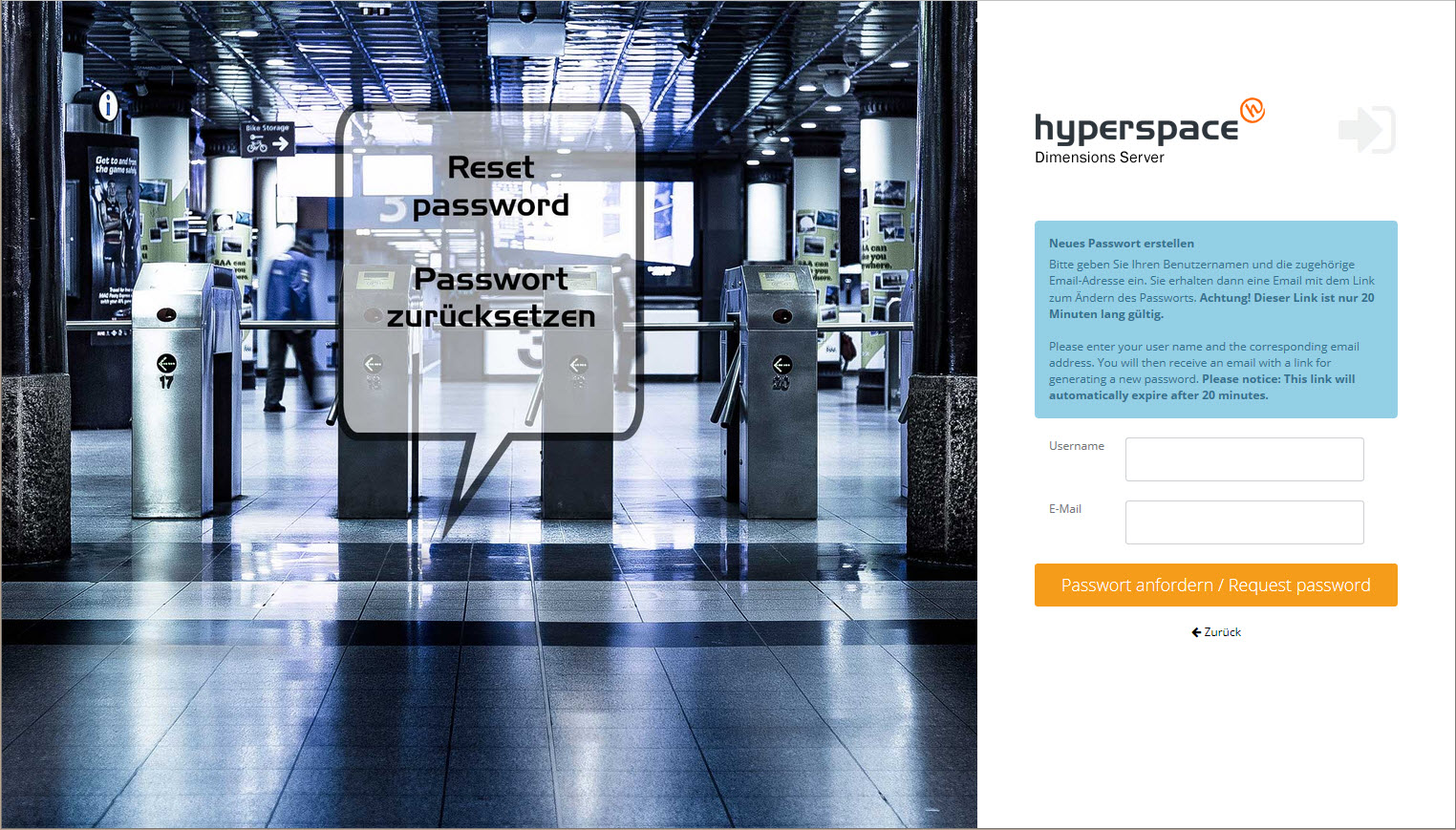 1.Geben Sie Ihren Usernamen und Ihre E-Mail-Adresse ein. Die E-Mail-Adresse muss die gleiche sein, die bei Ihrem Benutzerkonto in hyperspace Dimensions gespeichert ist. Klicken Sie dann [Passwort anfordern / Request password].