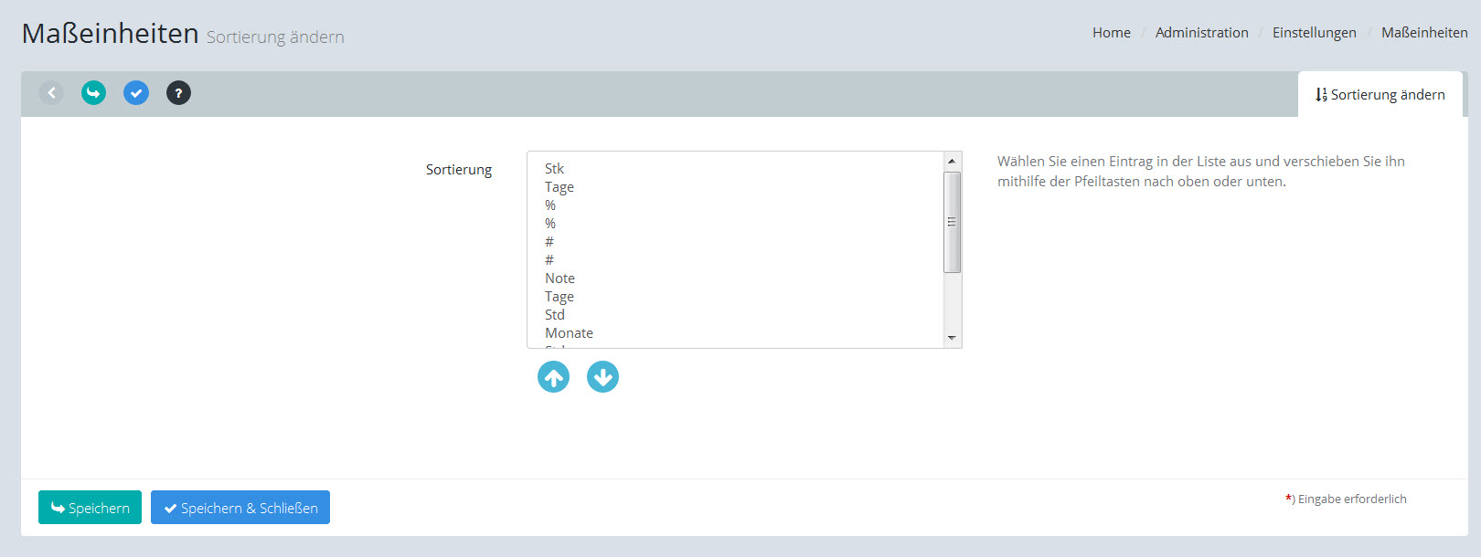 Markieren Sie die Maßeinheit, deren Reihenfolge Sie verändern wollen und benutzen Sie die Schaltflächen mit den Pfeil-Symbolen neben der Liste, um die markierte Maßeinheit zu verschieben.