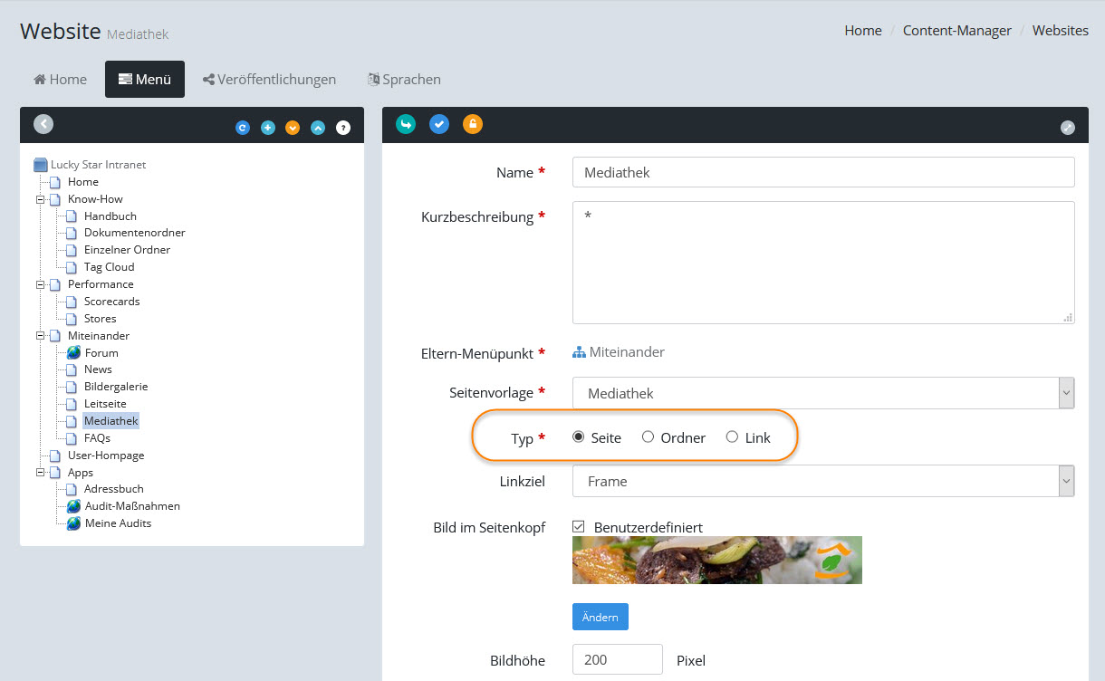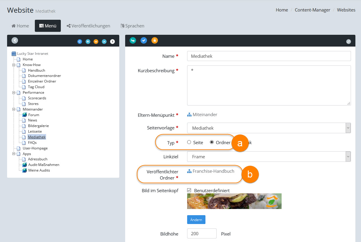 Abhängig von der Einstellung auf der entsprechenden Website im Contentmanager werden in der Mediathek die Dateien entweder mit Hilfe von Ordnern oder über eine direkte Zuordnung der Mediendateien zum Menüpunkt der Website veröffentlicht: