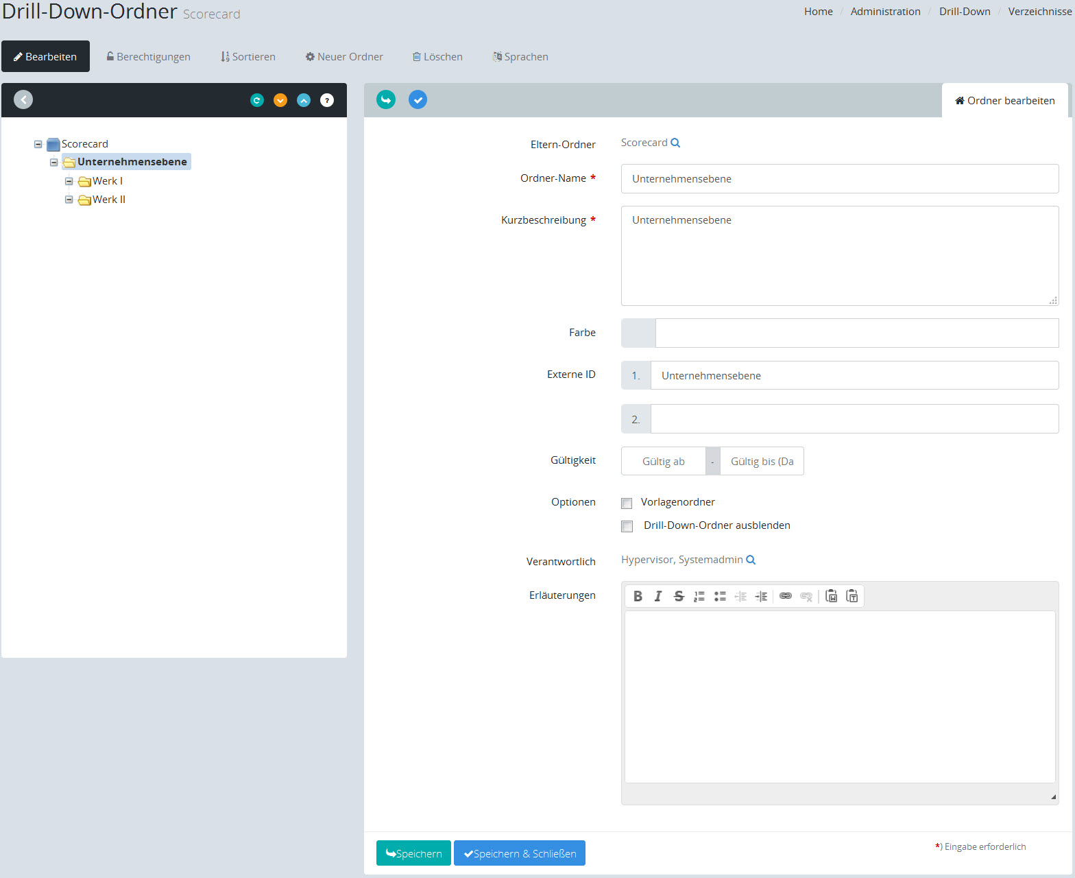 Hier können Sie die Optionen anpassen. Sie können in der Scorecards-Struktur einen Ordner als Vorlagenordner über die entsprechende Option deklarieren. Dort können Sie dann beliebig weitere Unterordner anlegen, um verschiedene Scorecardvorlagen zu verwalten. Sie können in der Scorecards-Struktur einen Ordner ausblenden. |