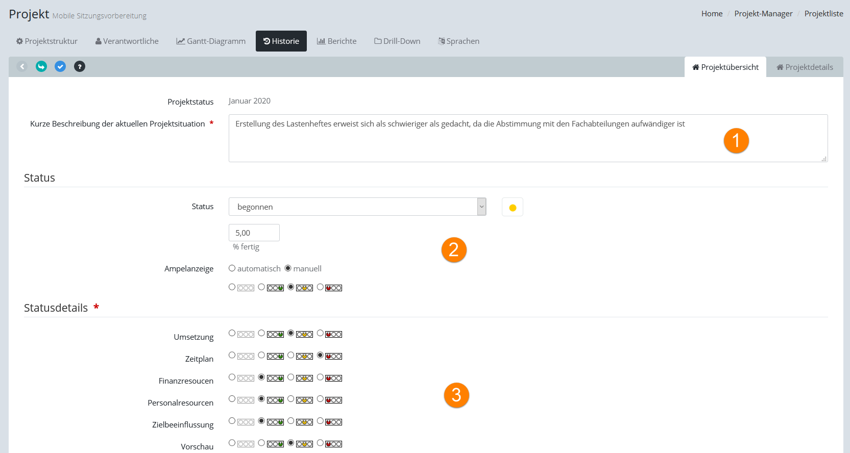 2.Gesamtstatus und %fertig können auch nachträglich noch manuell editiert werden