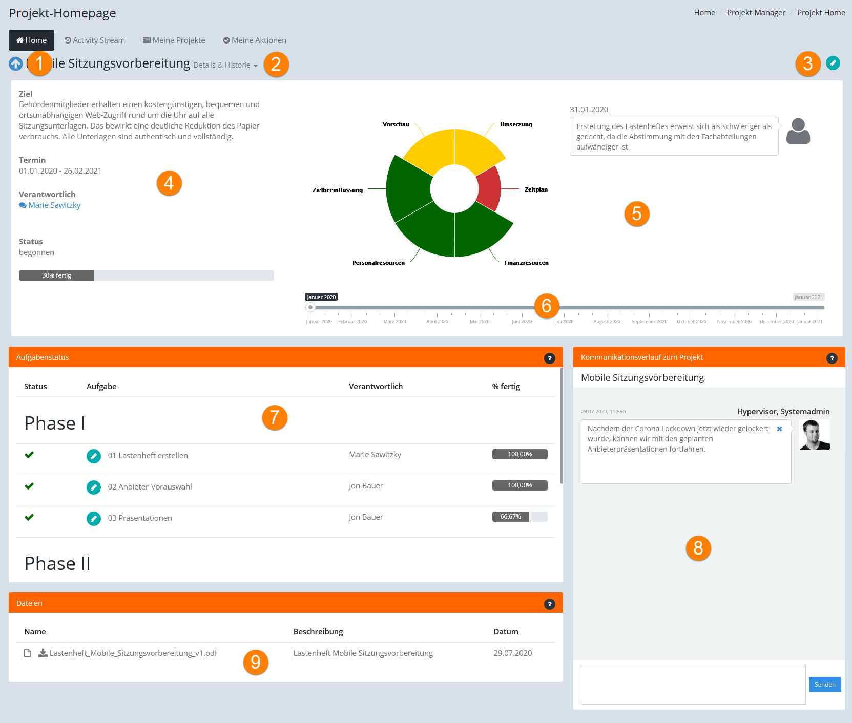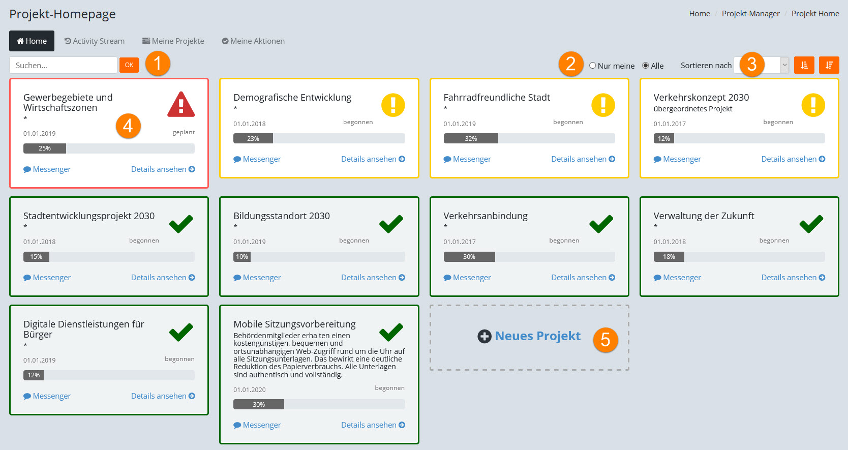 Die Projekt-Homepage zeigt den aktuellen Status der Projekte, die der eingeloggte Benutzer lesen darf: