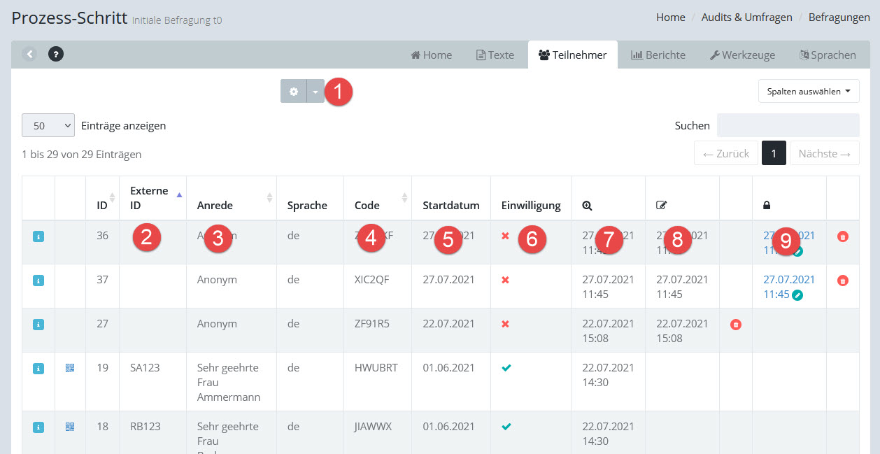 Prozess-Schritt einer Befragung: Teilnehmerliste bei Teilnahme durch Code-Eingabe