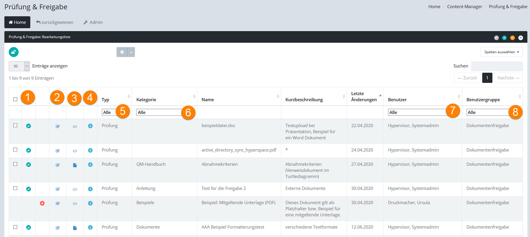 5.Filtermöglichkeit nach "Typ" des zuletzt durchgeführten Prozess-Schrittes (Prüfung, Freigabe)