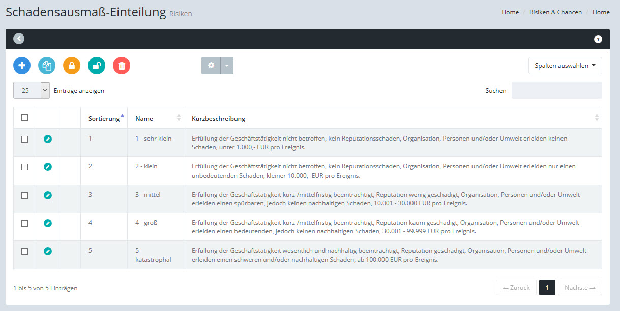 Sie können jeweils drei, vier oder fünf Unterteilungen für Schadensausmaß und Eintrittswahrscheinlichkeit definieren und auch deren Namen frei festlegen.