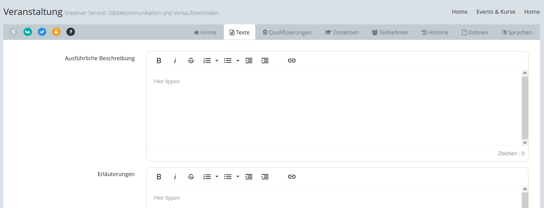 Auf dieser Registerkarte können Sie die Texte für die ausführliche Beschreibung, ERläuterungen, die Datenschutzerklärung und die Teilnahmebedingungen erfassen.