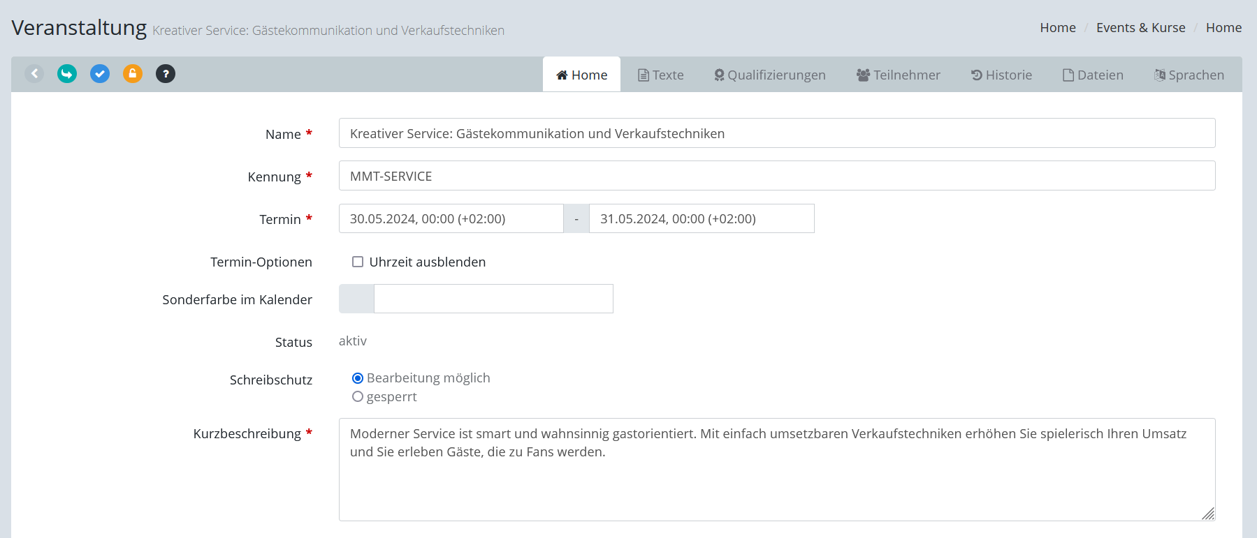 Wenn Sie eine Veranstaltung beenden, wird der Status für alle Teilnehmer, die an der Veranstaltung teilgenommen haben, auf "abgeschlossen" gesetzt und eine E-Mail mit dem Textbaustein "SQMCOURSES_FINISH" versendet.