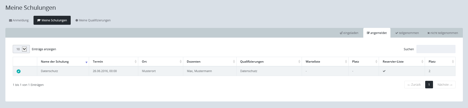 Alle Schulungen, zu dem der Teilnehmer eingeladen wurde. |