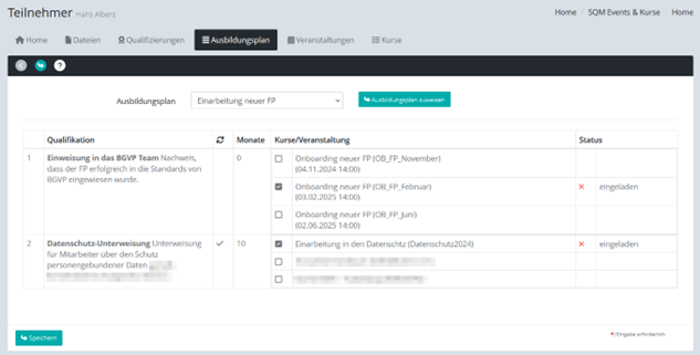 Durch Zuweisung eines Ausbildungsplans zu einem Teilnehmer kann man dann im nächsten Schritt sehr einfach und schnell festlegen, mit welchen Kursen und Events der Teilnehmer die entsprechenden Qualifizierungen erwerben soll. Die Qualifizierungen erscheinen dann automatisch beim Teilnehmer als „notwendige“ Qualifizierungen, und der Teilnehmer wird automatisch für alle ausgewählten Kurse eingeladen und bei den ausgewählten Events angemeldet.